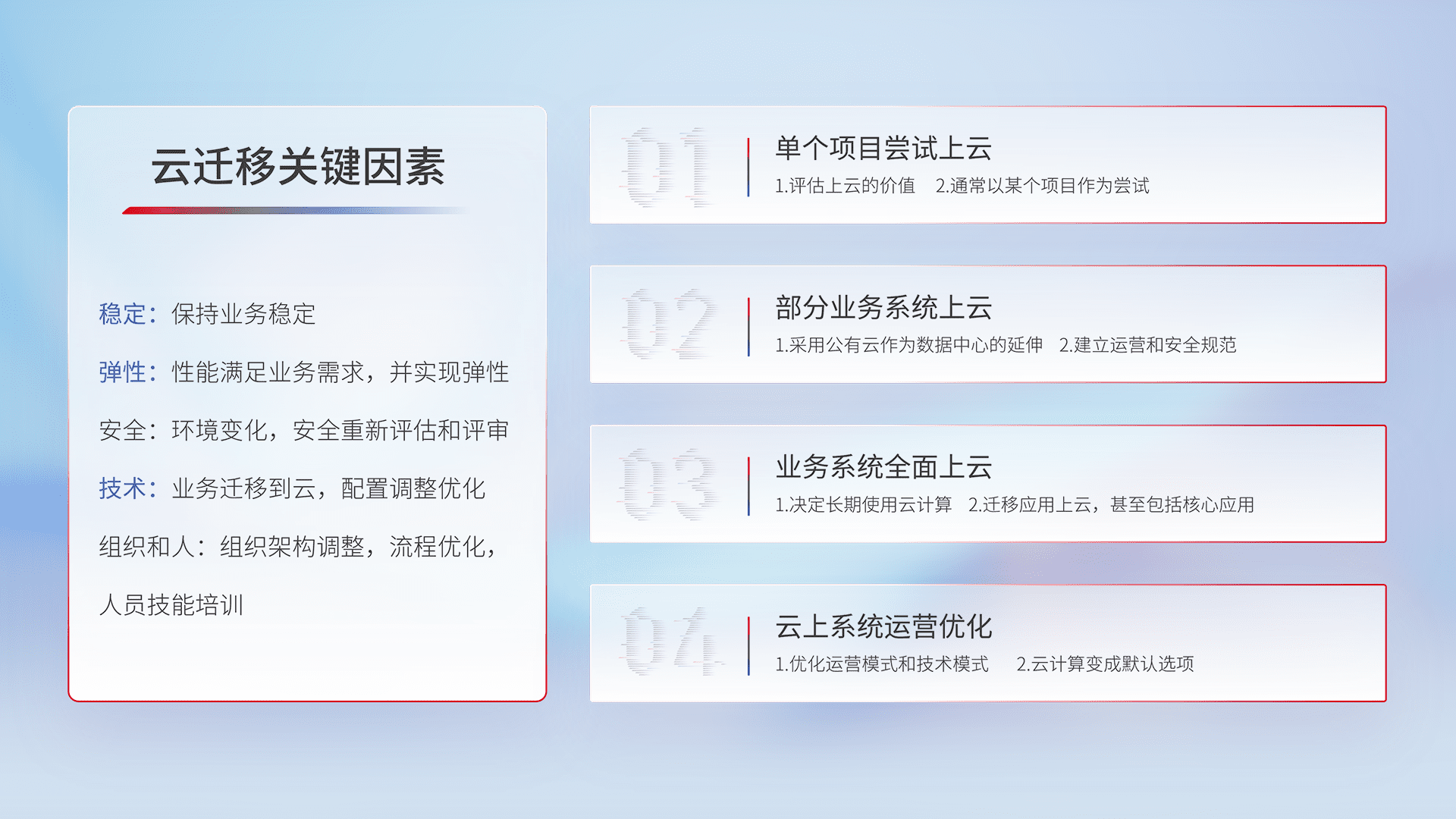 结合实际业务,,,从规划设计、、云平台选型、、、、云原生改造、、数据迁移、、、、集成交付,,,迁移全过程为客户识别最佳上云路径,,,,做好风险识别管理,,,,设计网络架构、、、、身份权限、、、、安全审计合规、、操作审计、、、日志审计、、、监控告警策略、、多站点容灾设计等,,,,对云上基础设施进行整体规划,,,提升IT治理水平,,,,以满足弹性、、高可用、、、高性能的需求。。。