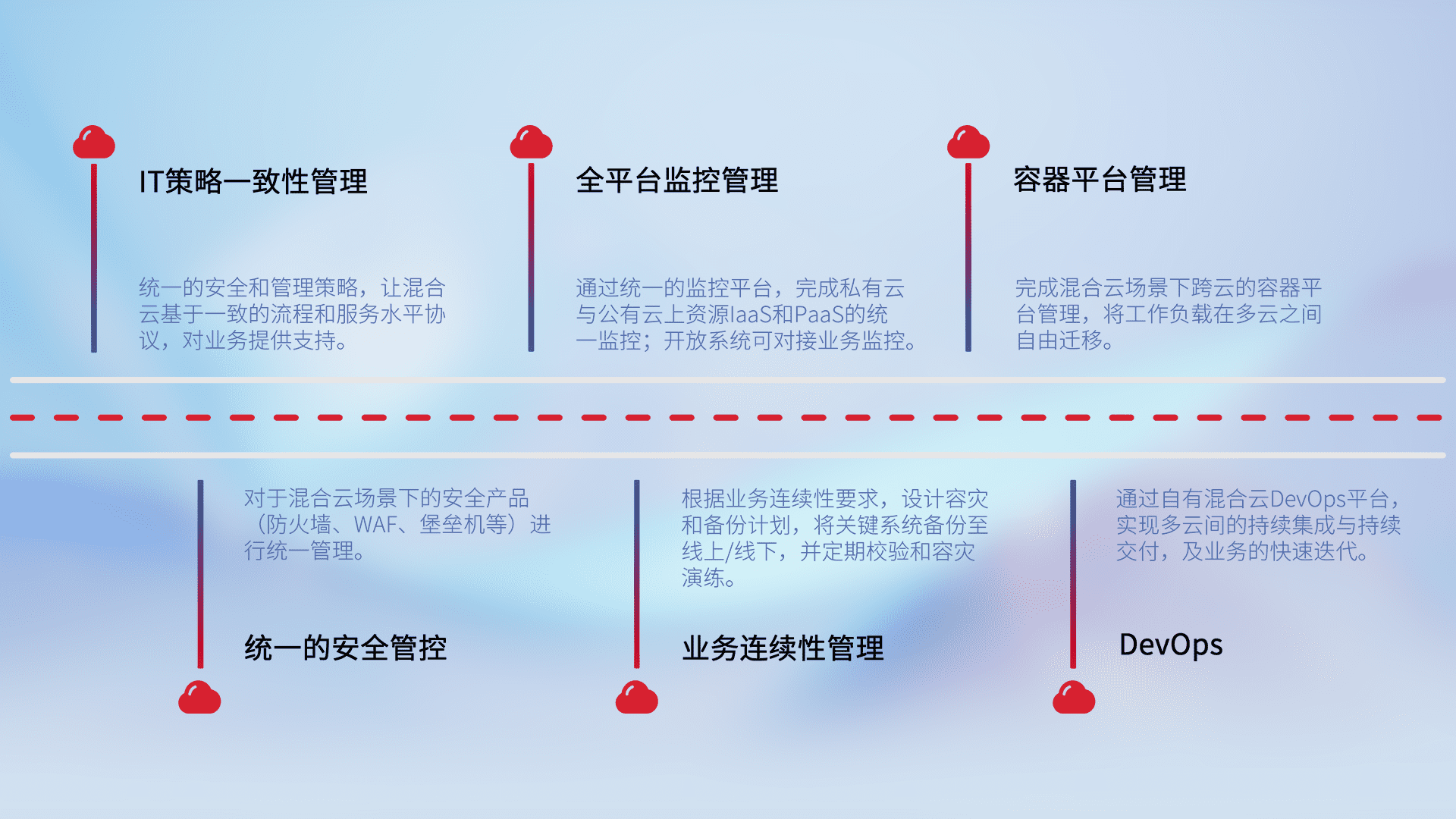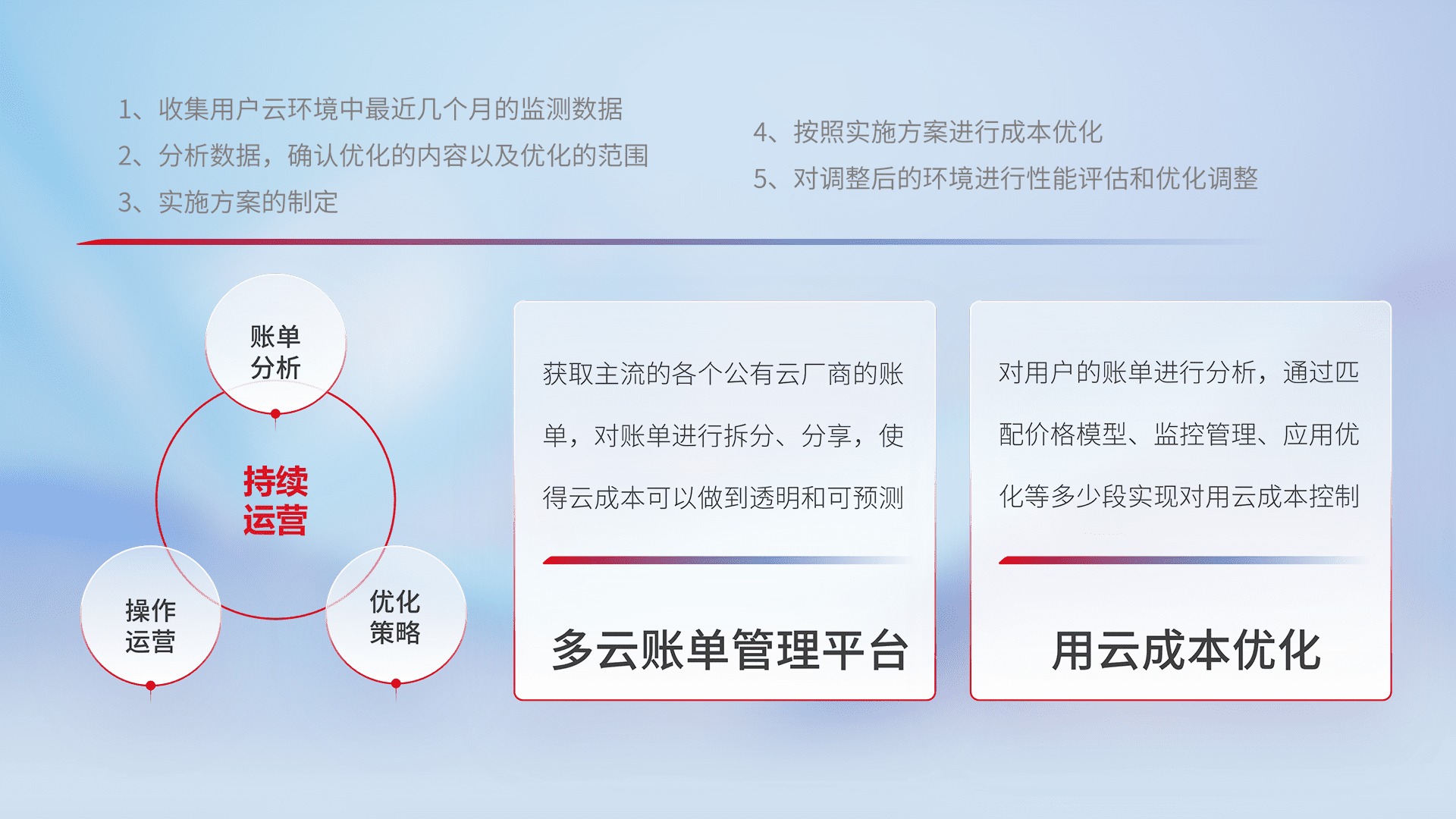 通过多云纳管,,以统一的资源数据模型把客户的云资源进行抽象和封装,,,进而实现对多云资源的统一操作,,,保障云资源管理的可靠性、、、、稳定性与可用性。。。量身定制化运维内容,,配置、、开发运维、、、、补丁管理、、备份、、、监控、、、认证和访问管理、、审计和日常巡检等,,,,保障在用云过程中的可靠度,,,,稳定度以及高可用率。。