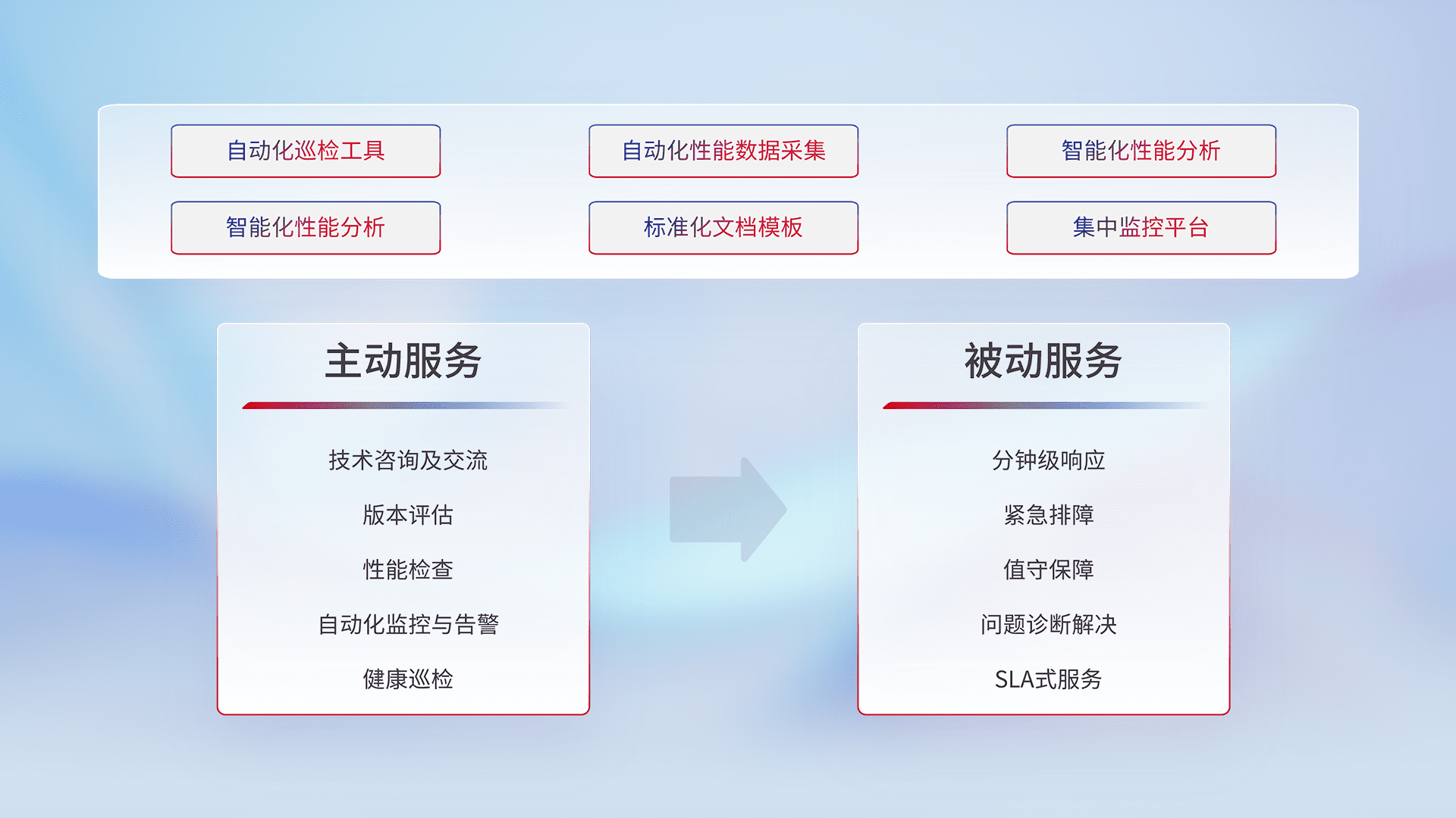 智能化工具和标准化文档,,,,保障服务质量,,,提供主动服务(包含技术咨询、、版本评估、、、性能检查、、、自动化监控与告警、、、健康巡检)和被动服务包含(分钟级响应、、紧急排障、、、值守保障、、、、问题诊断解决、、、、SLA服务)。。。